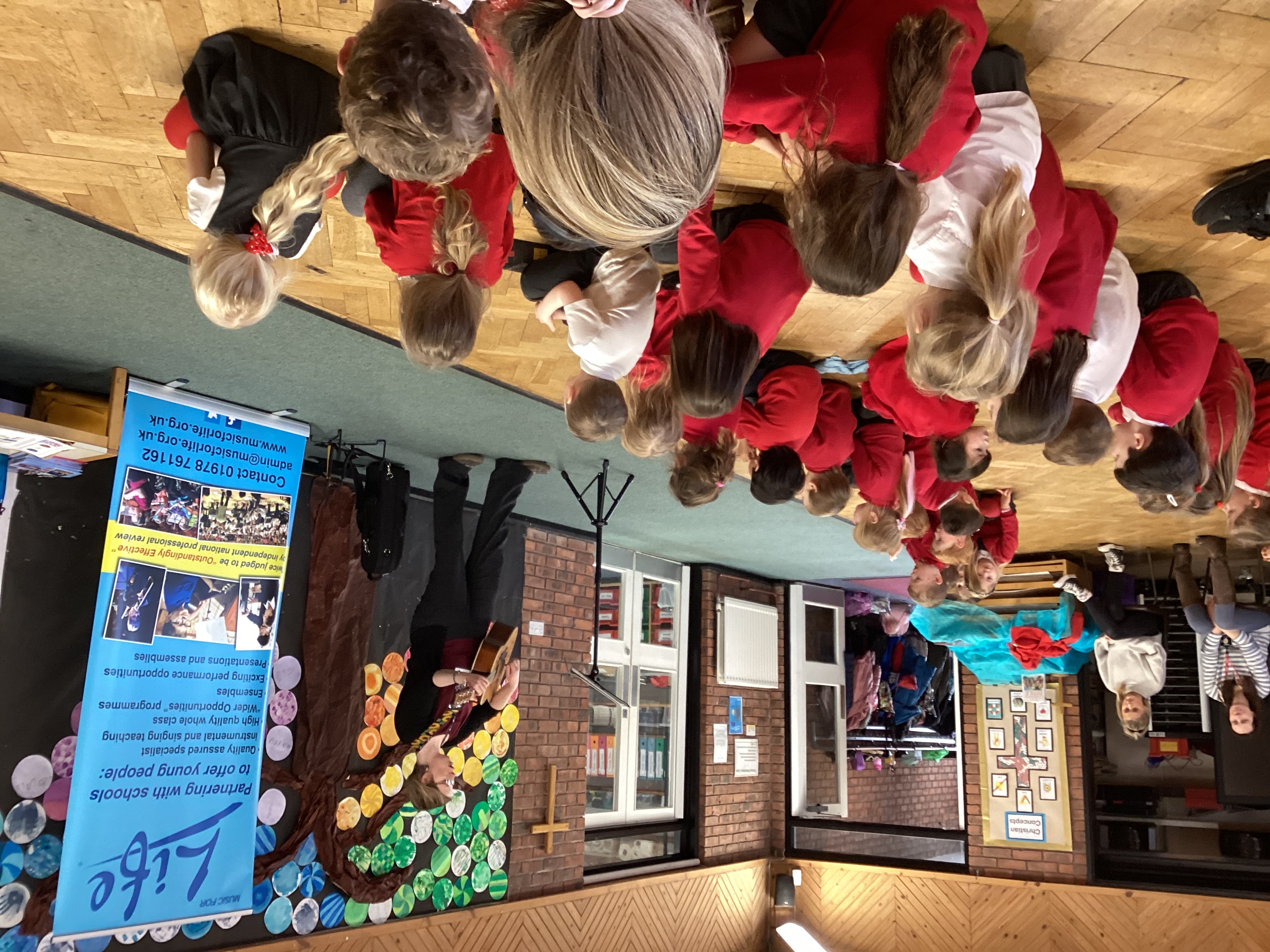 Eve from Music for Life came to see us yesterday. She played and sang to us and talked about instruments we could learn with Music for Life. We had fun joining in with her songs and doing the actions.